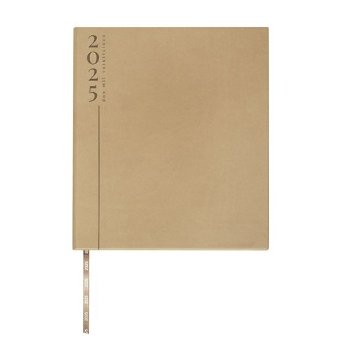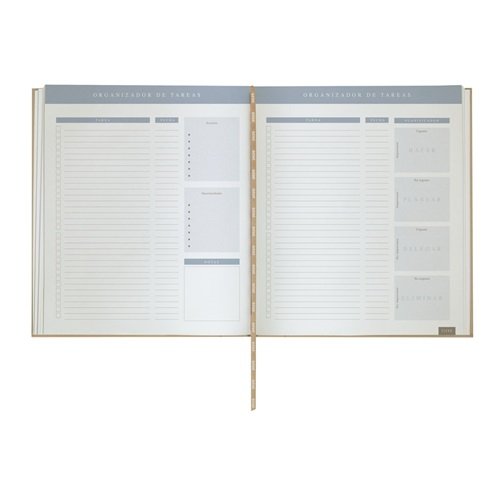 Agenda semanal con 80 hojas. Contiene datos personales, calendarios 2024-2025-2026, planeador 2025, presupuesto de gastos, seguimiento de nuevos hábitos, organizador de tareas, planeador de proyecto y días festivos. Incluye caja individual.